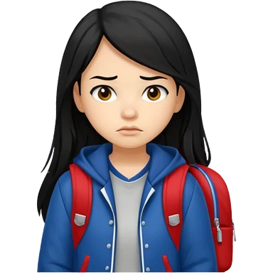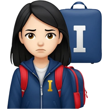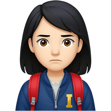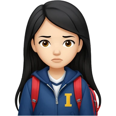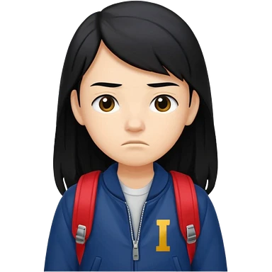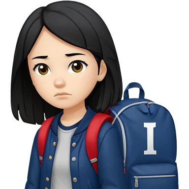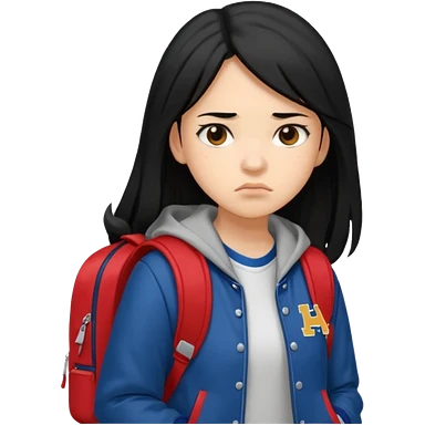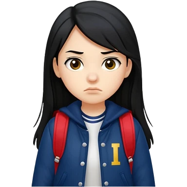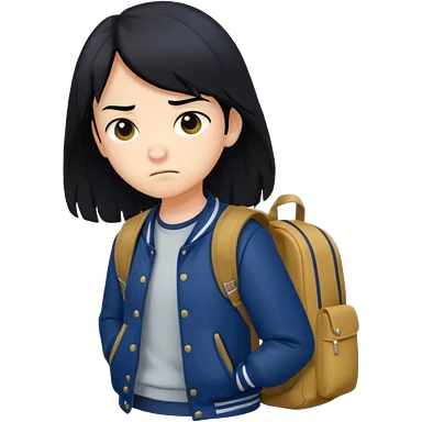 college student with annoyed face , black hair , with navy varsity jacket( initial I) and and backpack , girl, long hair, emoji