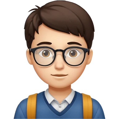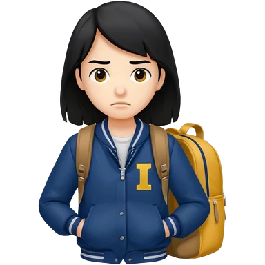 college student with annoyed face , black hair , with navy varsity jacket( initial I) and backpack , girl, long hair, emoji