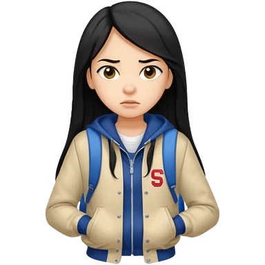 college student with annoyed face , black hair , with varsity jacket and backpack , girl, long hair, emoji