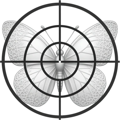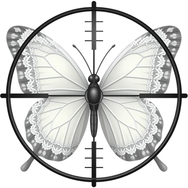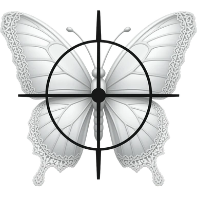 subtle elegant white butterfly, 3D emoji gothic butterfly, white velvet, white filigree, white lace trim, medium black sniper crosshair overlay emoji