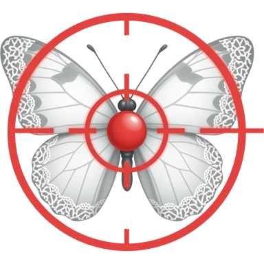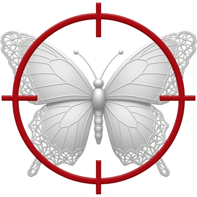 subtle elegant white butterfly, 3D emoji gothic butterfly, white velvet, white filigree, white lace trim, red sniper crosshair overlay emoji