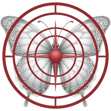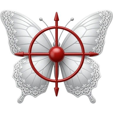 subtle elegant white butterfly, 3D emoji gothic butterfly, white velvet, white filigree, white lace trim, medium red sniper crosshair overlay emoji