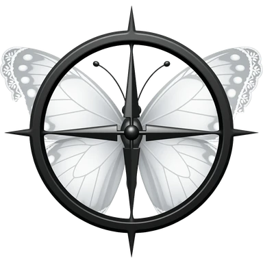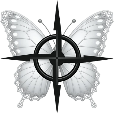 subtle elegant white butterfly, 3D emoji gothic butterfly, white velvet, white filigree, white lace trim, black sniper crosshair emoji