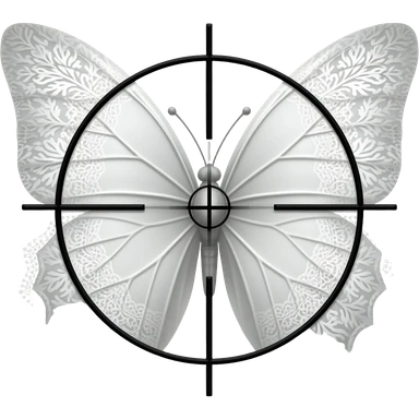 subtle elegant white butterfly, 3D emoji gothic butterfly, white velvet, white filigree, white lace trim, black sniper crosshair overlay emoji