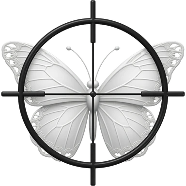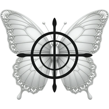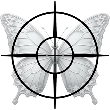 subtle elegant white butterfly, 3D emoji gothic butterfly, white velvet, white filigree, white lace trim, large black sniper crosshair overlay emoji