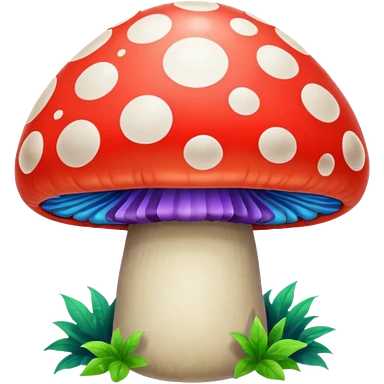 A round psychedelic colored button with bezeled edges and rainbow colored mushrooms emoji