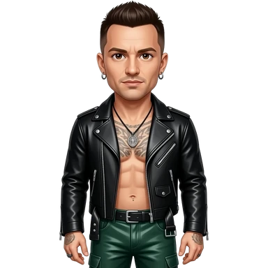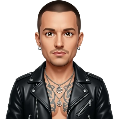 Chester Bennington with dark brown eyes, dark brown buzz cut hair, black metallic rock jacket, dark green metallic rock baggy pants, shirtless with necklace and earrings emoji