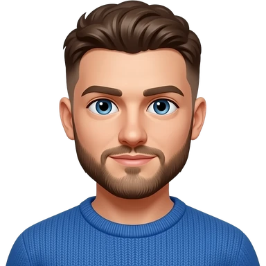BW - young man, blue eyes, early 20s, light brown skin fade very short on top textured hair, full short beard, blue jumper emoji