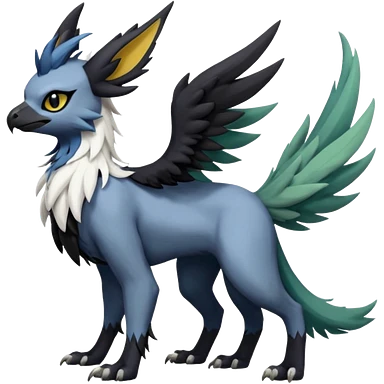 Dark-deep-colored gryphon-Trico-Nargacuga-Absol-Leafeon-Sprigatito-Silvally-fusion-hybrid with a long tufted tail, black beak, black claws, black tail, majestic, realistic, furry (full body) emoji
