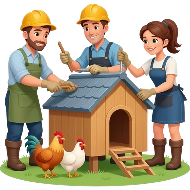 Construire un poulailler avec deux hommes des bricoleurs homme et bricoleuse deux femme et des poules c emoji