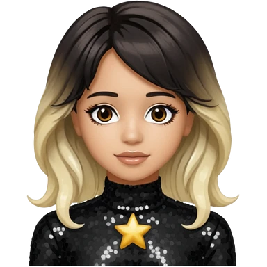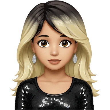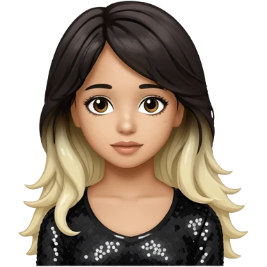 Camila Cabello from Fifth Harmony with long dark brown with platinum blonde highlights hair, black sequin outfit emoji
