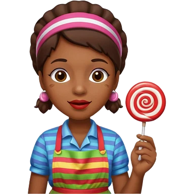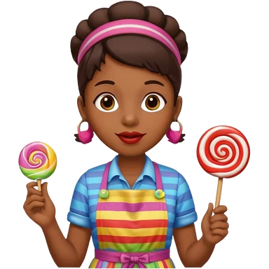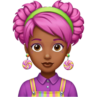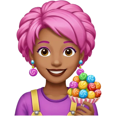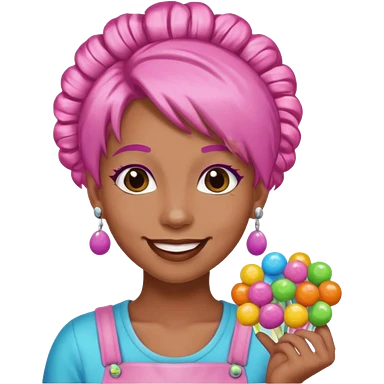 candy shop vendor, looking like candy with candy earrings and candy hair emoji