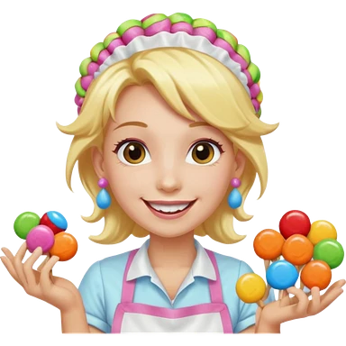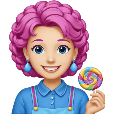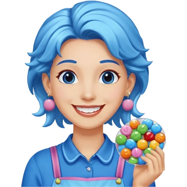 candy shop vendor, looking like candy with candy earrings and candy hair with big smile and blue emoji