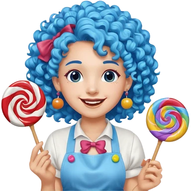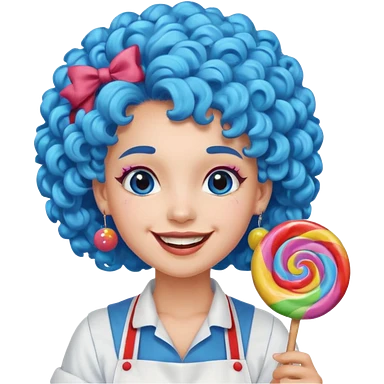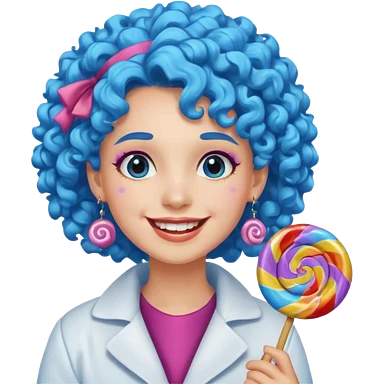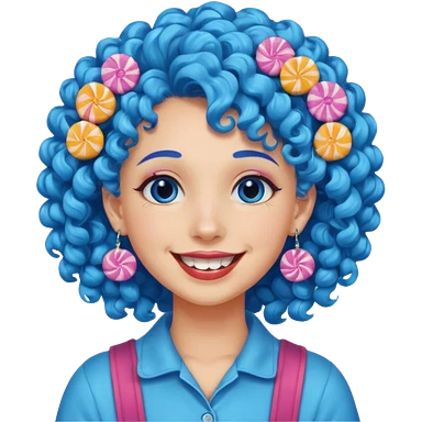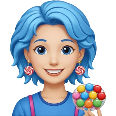 candy shop vendor, looking like candy with candy earrings and candy hair with big smile and blue curly hair emoji