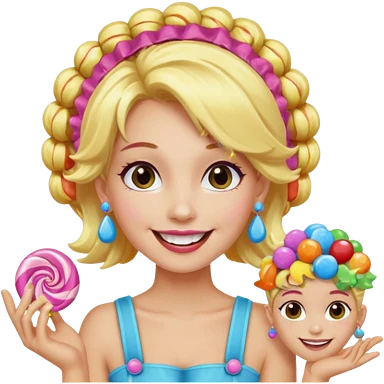 candy shop vendor, looking like candy with candy earrings and candy hair with big smile and blond hair emoji