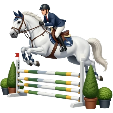 Caballo blanco bonito con montura y un jinete; y saltando un salto emoji