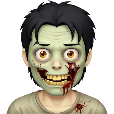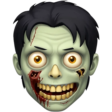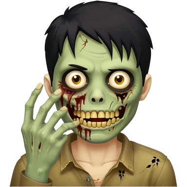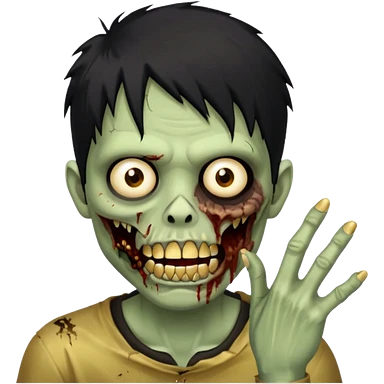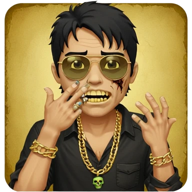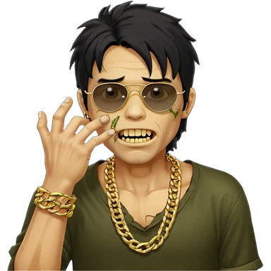 cabelo liso desordenado negro homen con aparencia de zombi y que haga un gesto mostrando los dientes de oro que se agarre la boca con la mano y que sea color piel, ponle unas gafas brasileñas, una camisa negra y que tenga cadenas de oro emoji | AI Emoji Generator