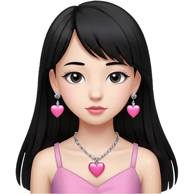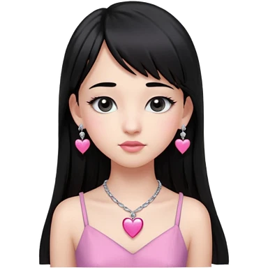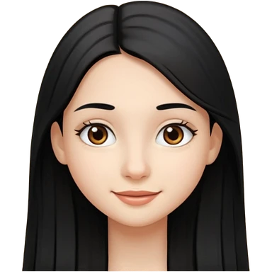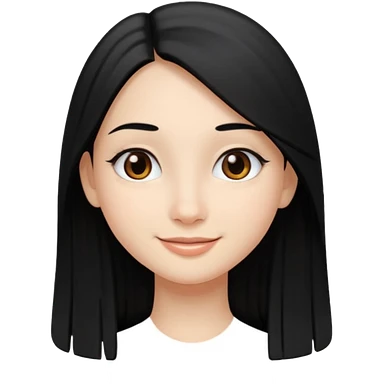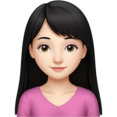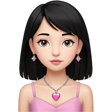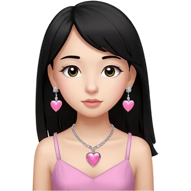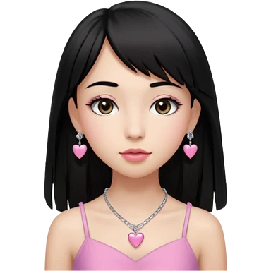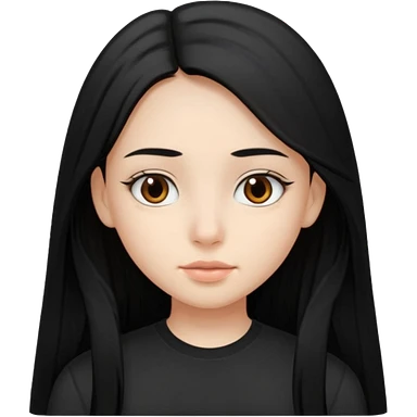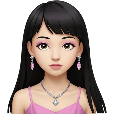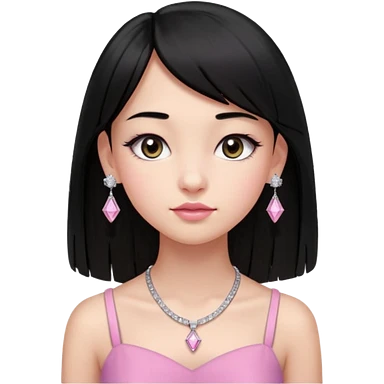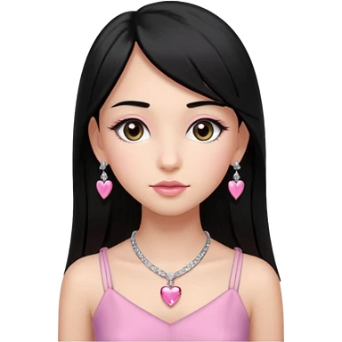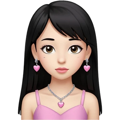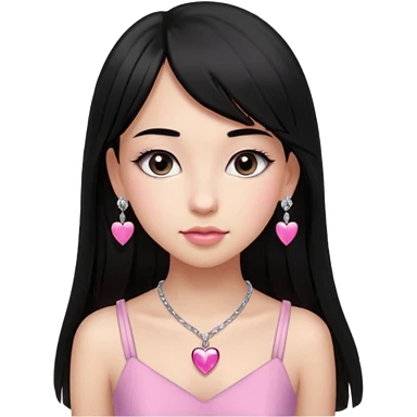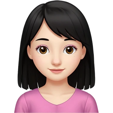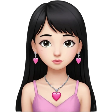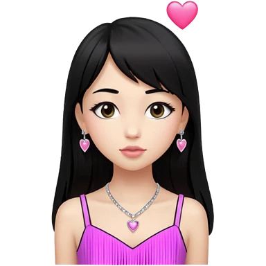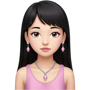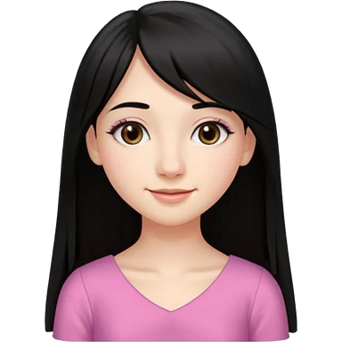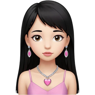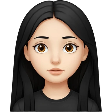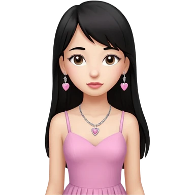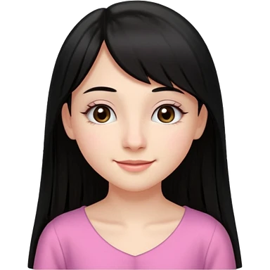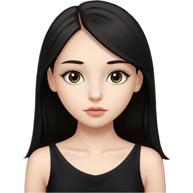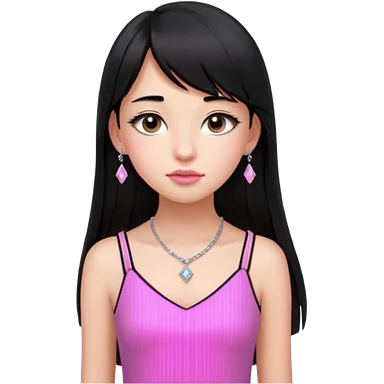 Cabelos pretos longos lisos ,olhos pretos escuros puxadinho para cima com cílios grandes Pele clara ,nariz pequeno ,lábios mais carnudos ,adolescente 16 anos , com vestido de alinhamento emoji | AI Emoji Generator