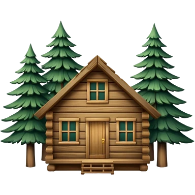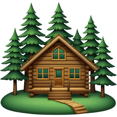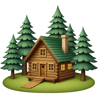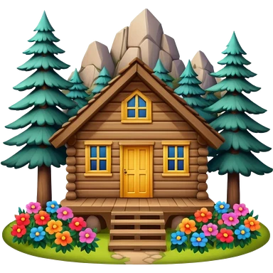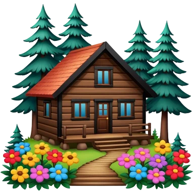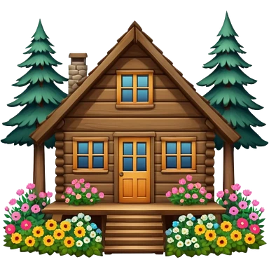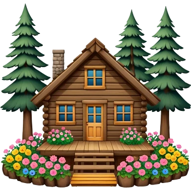 cabin in the woods, surrounded by pines, with flowers around emoji