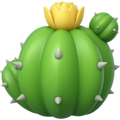 Cactus is a spherical dark green cactus with several white spikes protruding out of its surface, it has 2 eyes with huge pupils and highlights above it is a bright pink flower. Behind the Cactus is a stem holding a smaller cactus base appearing as a catapult emoji