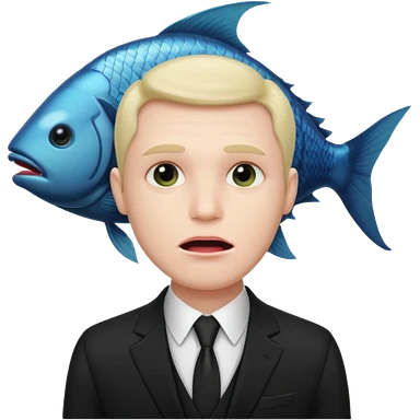 A man dressed in a black suit. His face is that of a fish — therefore, he has no human face. The fish’s face is positioned vertically, meaning its mouth is facing upward. emoji