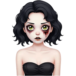 Quero uma garota Zumbi, que ela tenha cabelo preto e ondulado SÓ nas pontas! Olhos pretos, cílios, esteja usando um cropped preto tomara que caia. emoji