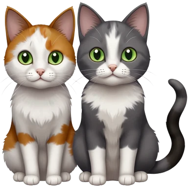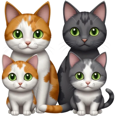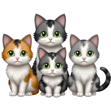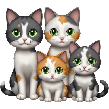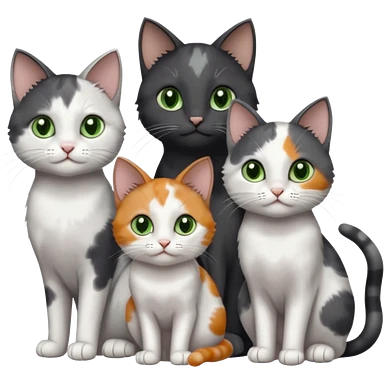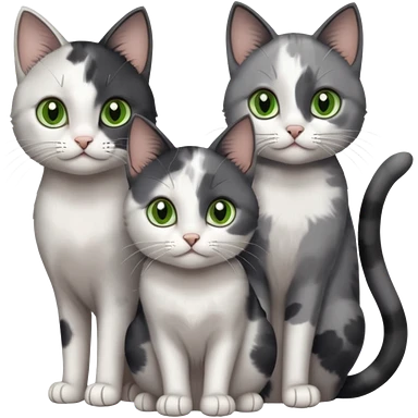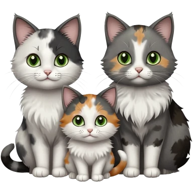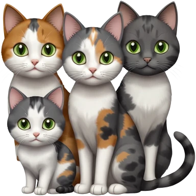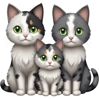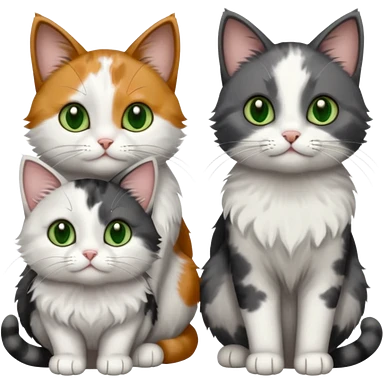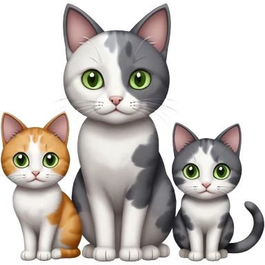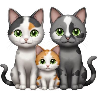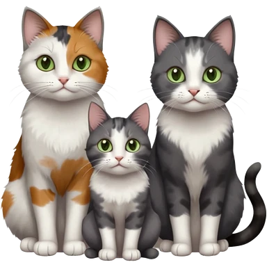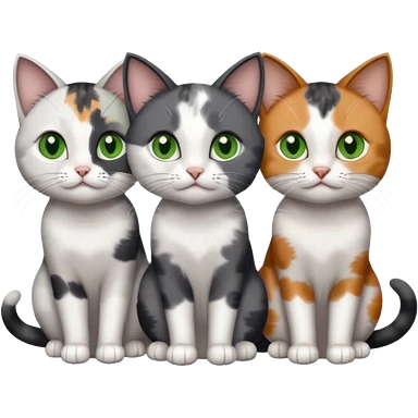 3 different coloured small cats including a dark grey and white, and a patchy calico with hazel eyes and a completely solid dark grey with green eyes and only white paws emoji