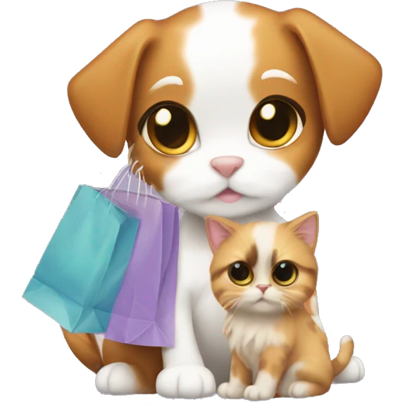 Calico cat and Shitzu puppy with shopping bags emoji | AI Emoji Generator