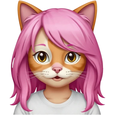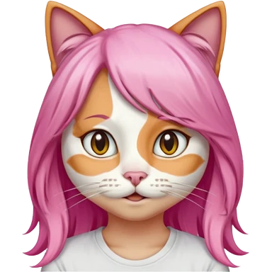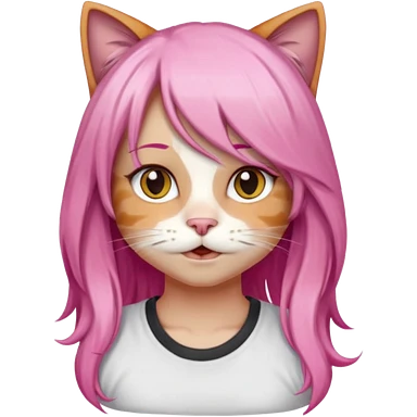 calico cat wear long pink hair wig, white T-shirt emoji | AI Emoji Generator
