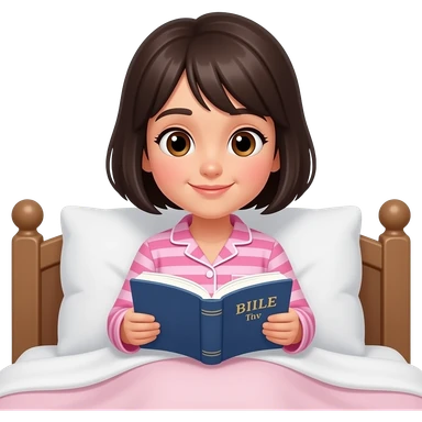 chica de cabello oscuro y corto sin accesorios, con ojos color cafe, con una pijama color rosa con rayas, leyendo la biblia en su cama emoji