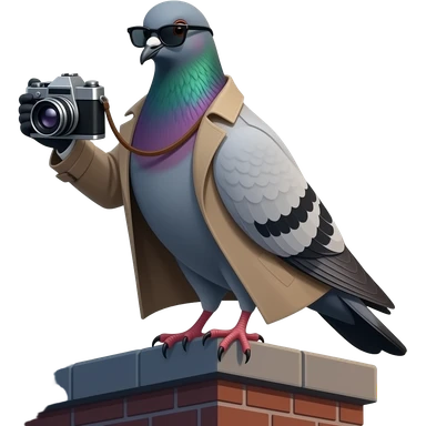 spioniro golubiro, secret agent pigeon in coat, sunglasses and with a photo camera emoji