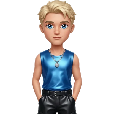 Cameron from Bratz with light skin, blue eyes, blonde hair, blue metallic sleeveless shirt, black metallic baggy pants, silver necklace emoji