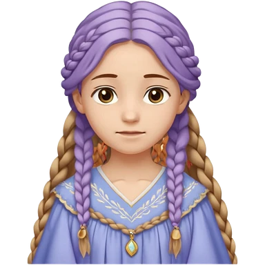 Joven de unos 20 años, de aspecto dulce y elegante. Piel clara, ojosy expresivos, sonrisa triste. Rubio o castaño claro, largo, con trenzas o velo. -Vestido largo de tonos suaves (blanco, azul o lavanda), con bordados dorados; un manto o toca fina cubriendo la cabeza. emoji