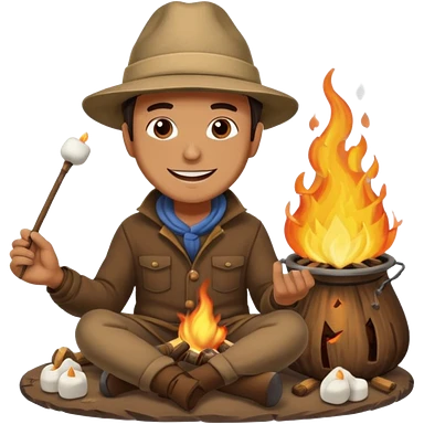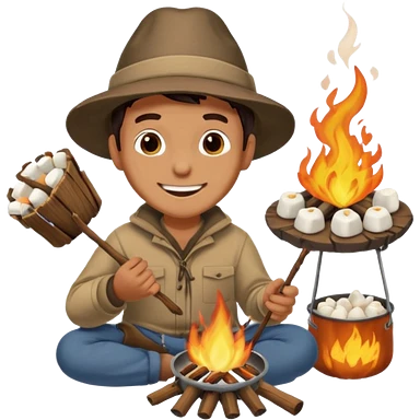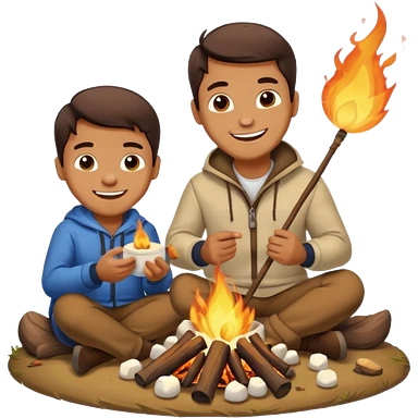 Illustrate a whimsical emoji of a cozy campfire with a happy face in the flames, surrounded by tiny roasting marshmallows on sticks emoji