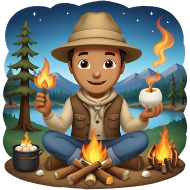Create an emoji showing a small campfire with glowing flames under a starry night sky. Include a crescent moon and tall pine trees in the background. Use soft lighting and warm colors to evoke a cozy, outdoor camping vibe. emoji