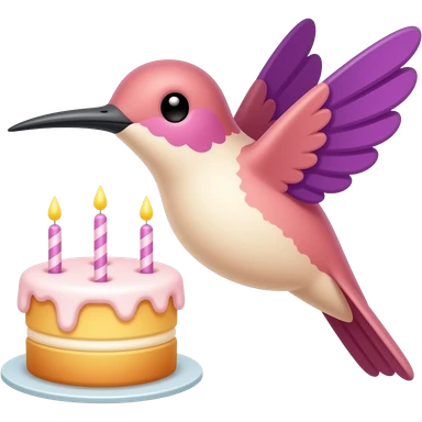 A small peach color and purple hummingbird emoji simple flying with a cake emoji