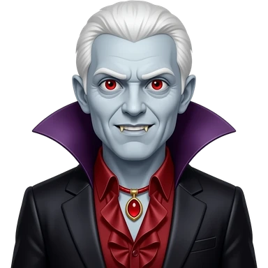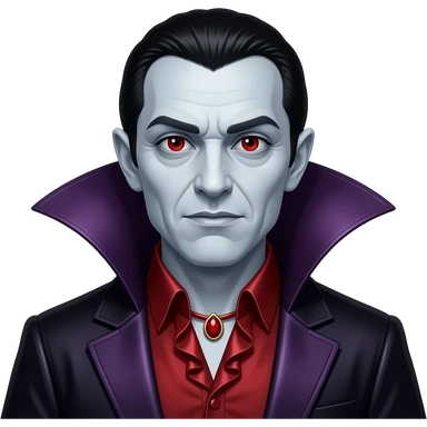 Count Dracula with pale-grey skin, red eyes, black and white hair, dark red metallic ruffle shirt, red necklace, dark violet metallic cape emoji