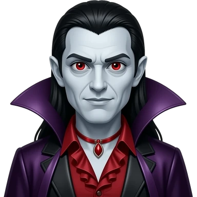 Count Dracula with pale-grey skin, red eyes, long black hair, dark red metallic ruffle shirt, red necklace, dark violet metallic cape emoji