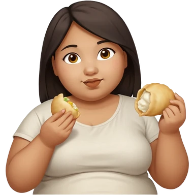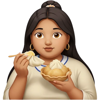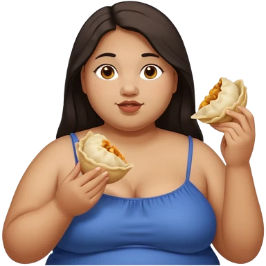 Can you create an emoji of a half Indian - half white 23 year old girl with dark brown mid length hair and brown eyes who is super obese and eating a dumpling. Full body and make her really fat emoji | AI Emoji Generator