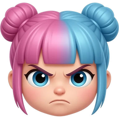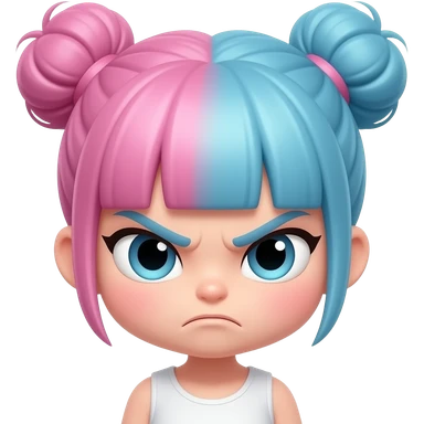 Can you make a chibi girl that has pink and blue has buns hair and the hair is in buns and has a angry face emoji