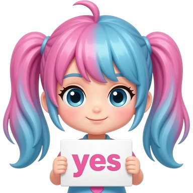 Can you make a chibi girl that has pink and blue hair with a sign that says yes emoji