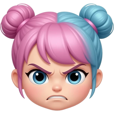 Can you make a chibi girl that has pink and blue hair and the hair is in buns and has a angry face emoji