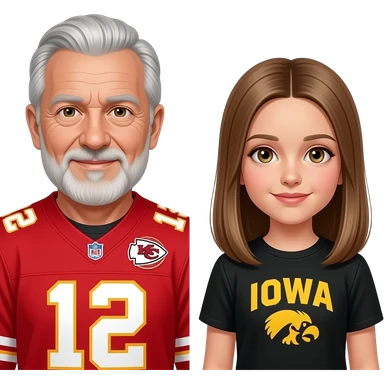 Can you make an old man with a chiefs shirt on and a girl with light straight brown hair with hazel eyes in a Iowa Hawkeyes shirt emoji