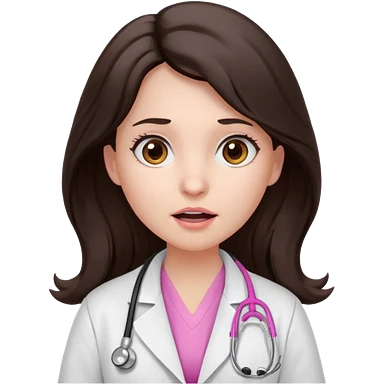 Barbie like emoji of a woman with white skin long wavy dark brown hair, brown eyes wearing a white lab coat and pink stethoscope and with a scared look emoji