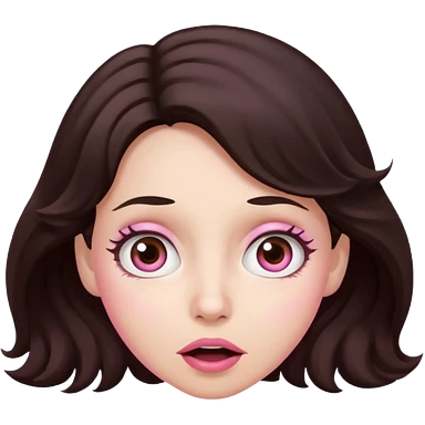 Barbie like emoji of a woman with white skin wavy dark brown hair, brown eyes wearing pink and with a surprised look emoji
