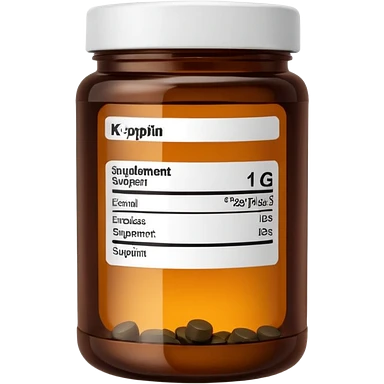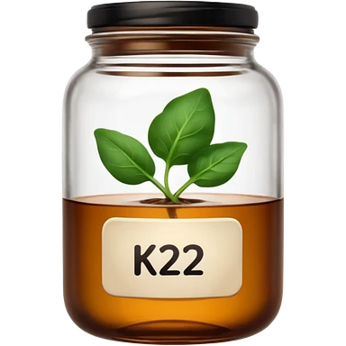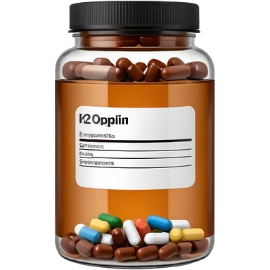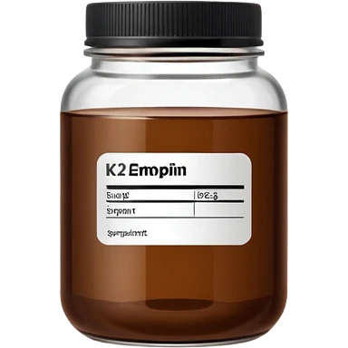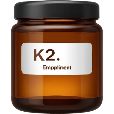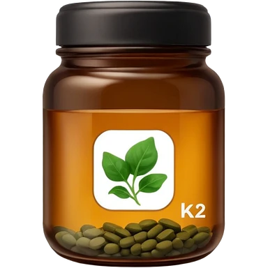 brown glass jar of supplements with white label, black thin title K2 emoji