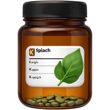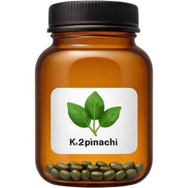 brown glass jar of supplements with white label, black thin title K2 and small spinach emoji emoji