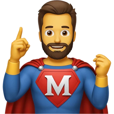 бородатый мужчина в костюме супер героя с буквой М на груди веселится emoji