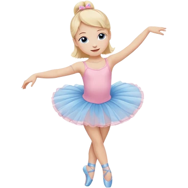 Little blonde girl with blue eyes doing ballet in a pink tutu and ballet slippers, cute emoji style, soft colors, happy expression emoji