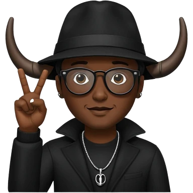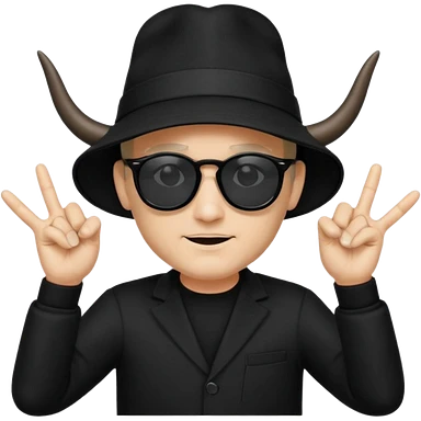 man dressed in black with dark glasses black Lens and a black hat making the horns gesture with both fingers hands emoji